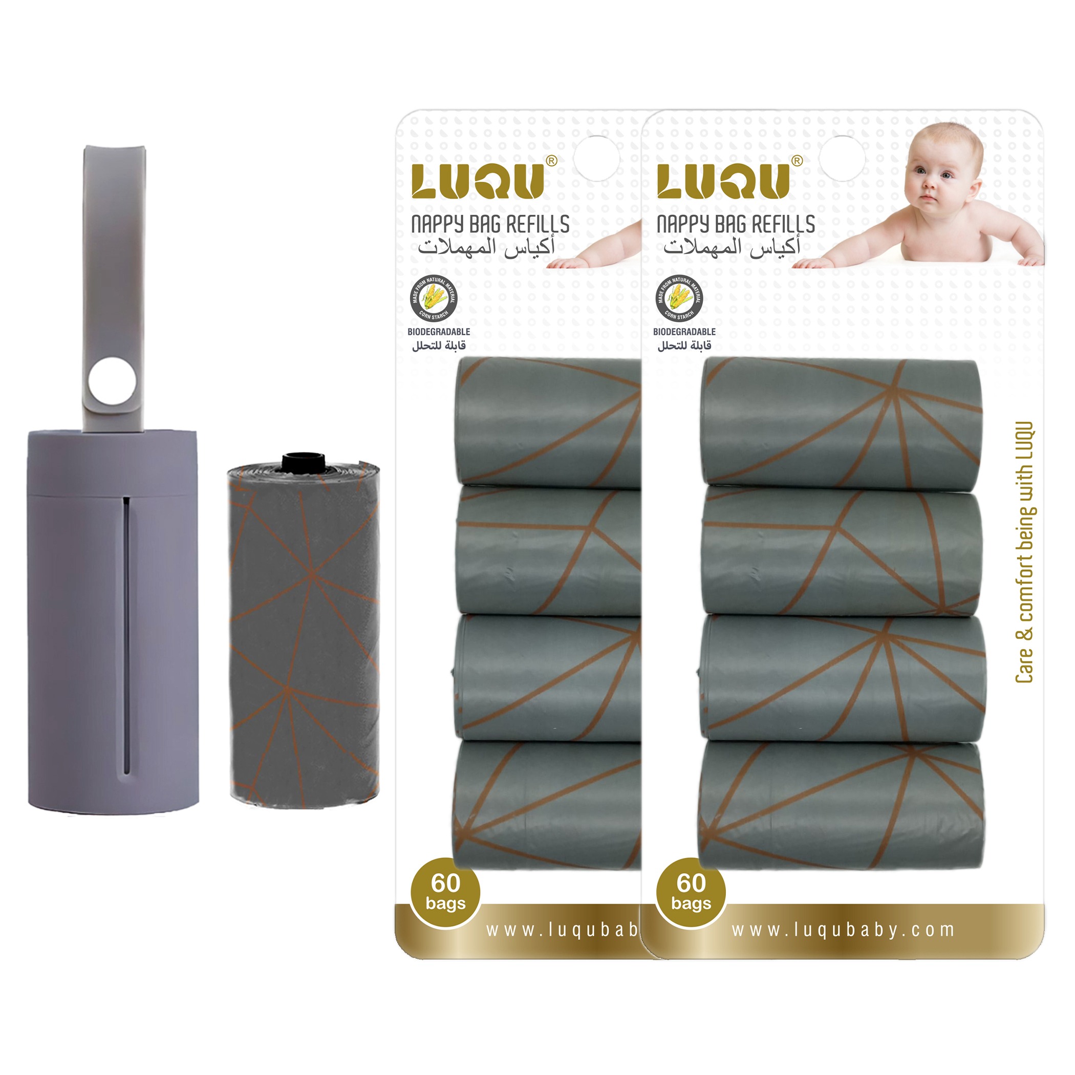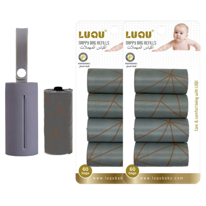 موزع أكياس حفاضات للأطفال (رمادي) ، أكياس نفايات قابلة للتحلل ، 6 بكرات إعادة تعبئة مع موزع-مناديل قطنية غير معطرة | فائقة النعومة