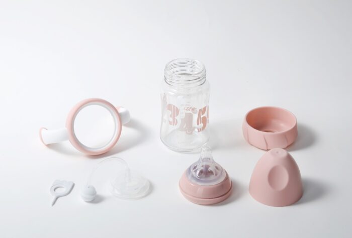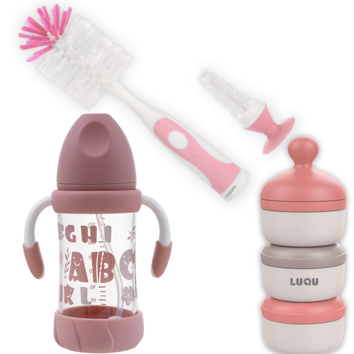 المجموعة تتضمن: 1-زجاجة فرشاة السيليكون: يسمح السيليكون عالي الجودة بأن تكون فرشاة الزجاجة الضيقة متينة للغاية وتدوم طويلاً. فرشاة التنظيف الطويلة لا تمتص الشحوم أو الروائح. فرشاة زجاجات ذات المقبض المريح للغاية وغير المنزلق لن تنزلق حتى في الأيدي الأكثر انزلاقًا والصابون. فرشاة زجاجات المطبخ مصنوعة من مادة خالية من مادة BPA. فرش الزجاجة متينة للغاية وتدوم طويلاً. لن تخدش ولا تمتص الدهون والروائح الكريهة. 2-موزع مسحوق الحليب : يقدم حلاً لإحدى المهام المتكررة التي يواجهها الآباء. قياس مسحوق الحليب الاصطناعي للأطفال بدقة قبل تحضير الرضعة. ستساعدك موزعات مسحوق الحليب سهلة الاستخدام هذه على تقسيم مسحوق الحليب الاصطناعي بشكل صحي مسبقًا سواء في المنزل أو خارجه. تتميز بثلاثة موزعات منفصلة قابلة للإغلاق بشكل فردي والتي يمكن ربطها معًا لتوفير المساحة. يتميز الموزع أيضًا بقمع عملي في الغطاء لضمان سهولة ملء زجاجات الأطفال دون إهدار أي مسحوق حليب صناعي. فهي لا تساعد فقط في جعل تحضير الحليب الاصطناعي أسهل لأفراد الأسرة الذين لم يعتادوا على تحضير حليب الأطفال. كما أنها قابلة للتكيف بشكل فائق؛ لماذا لا تستخدميها لتخزين أجزاء صغيرة من الحبوب أو الفاكهة عندما يكبر طفلك قليلاً. 3-زجاجة الحليب: جسم الزجاجة مصنوع من زجاج البورسليكات الشفاف والمقاوم للحرارة. جسم الزجاجة أملس، وليس من السهل تراكم مقياس الحليب، وسهل التنظيف، وليس من السهل أن ينكسر تحت درجة حرارة عالية مثل صب الماء المغلي. المقبض المزدوج المدمج مناسب للطفل للإمساك بالقش الأوتوماتيكي الذي يمكن أن يجعل الطفل يمتص الحليب بسهولة في أي وضع. قاعدة ناعمة وطوق ناعم يمكن أن يعزز مقاومة تأثير جسم الزجاجة. تصميم حلمة ناعم ومرن بفتحات تهوية يساعد على تقليل المغص والغازات والبصق. السلامة: خالية من مادة BPA