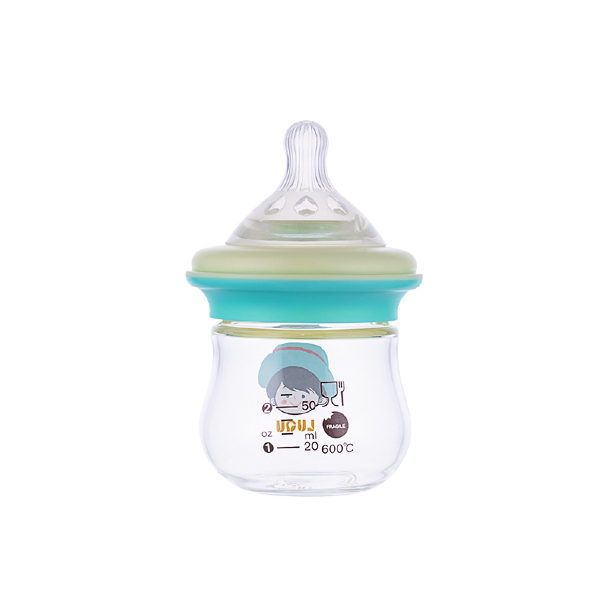 • زجاجة الرضاعة الزجاجية ذات العنق الواسع من لوكو باللون الأخضر مقاس 50 مل هي زجاجة رضاعة آمنة ومتينة مصنوعة من زجاج البورسليكات عالي الجودة.